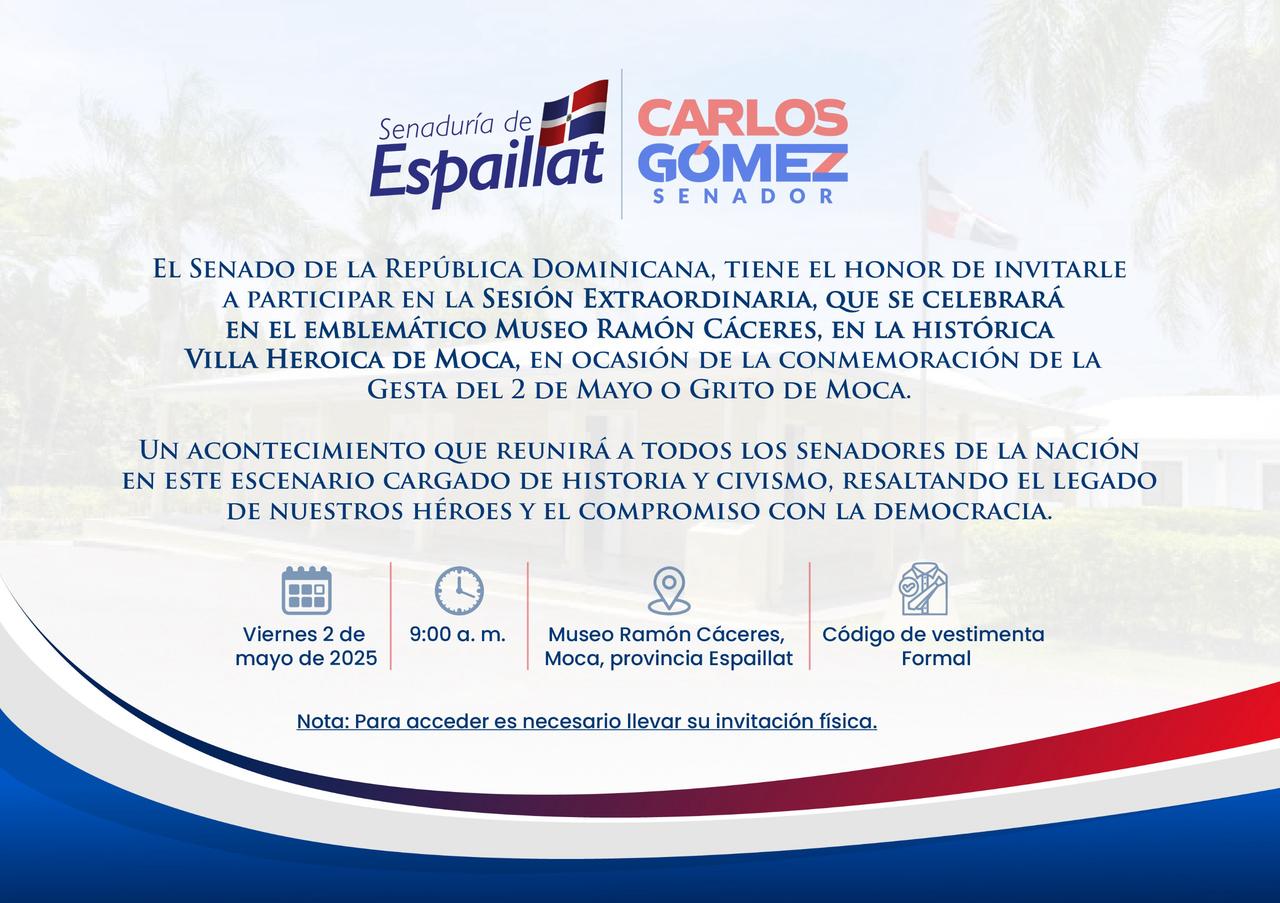 Este viernes 2 de mayo de 2025, el Senado de la República Dominicana celebrará una sesión extraordinaria en la ciudad de Moca, Provincia Espaillat