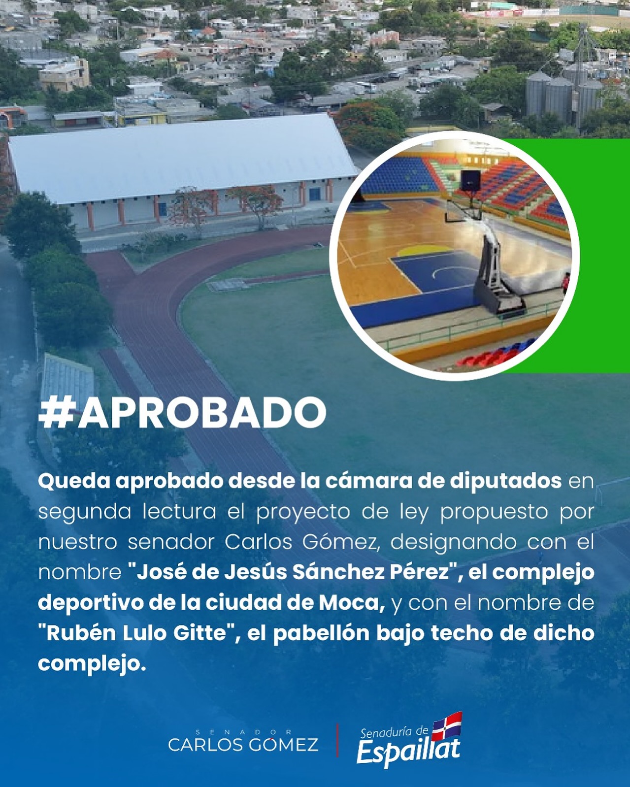 Queda aprobado desde la cámara de diputados en segunda lectura el proyecto de ley propuesto por nuestro senador Carlos Gómez, designando con el nombre “José de Jesús Sánchez Pérez”, el complejo deportivo de la ciudad de Moca, y con el nombre de “Rubén Lulo Gitte”, el pabellón bajo techo de dicho complejo.