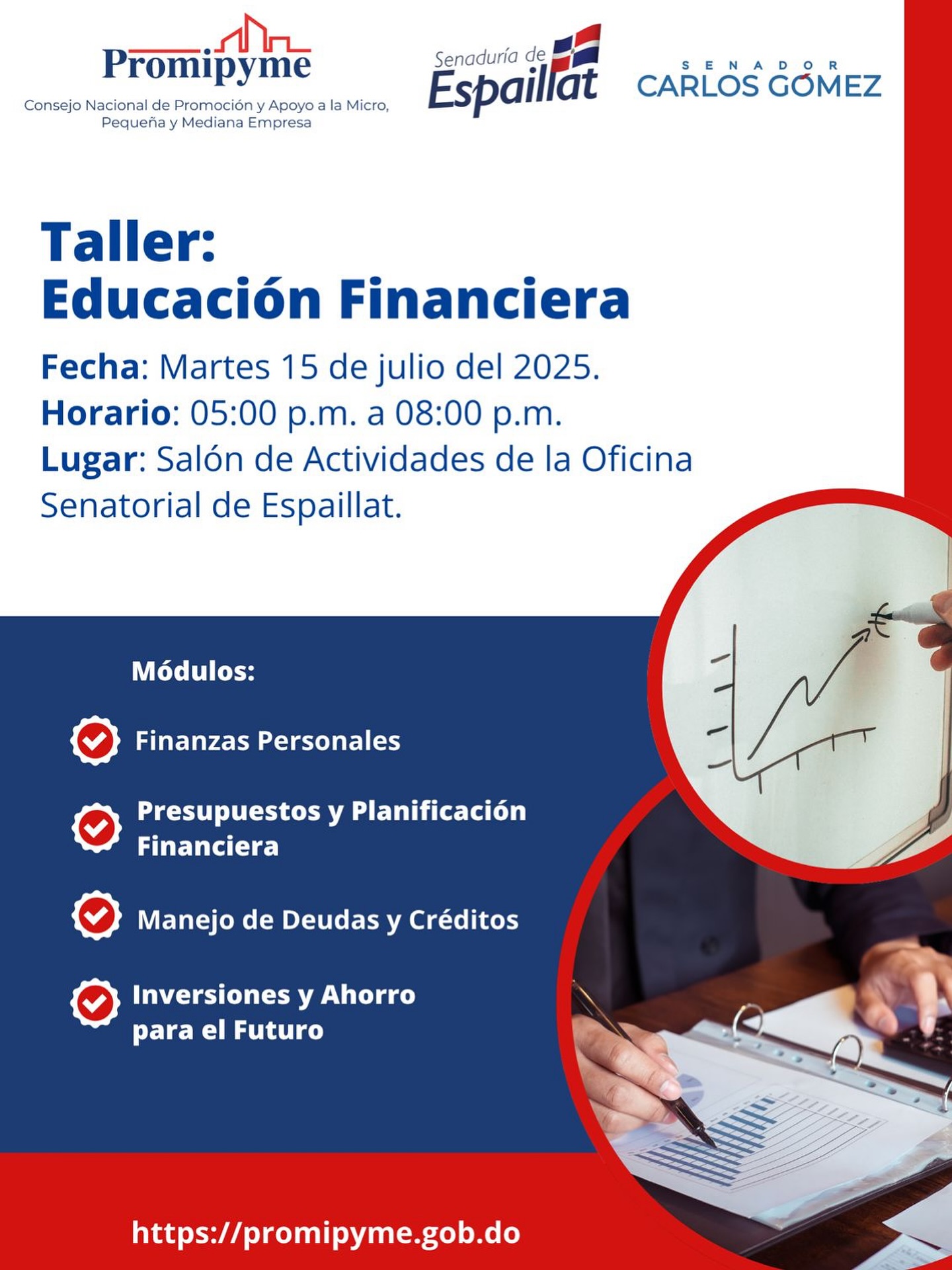 El senador Carlos Gómez y Promipyme te invitan al Taller de Educación Financiera, abierto a todo el público, con el propósito de fortalecer tus conocimientos y brindarte herramientas para tomar decisiones económicas más inteligentes. 💡💰